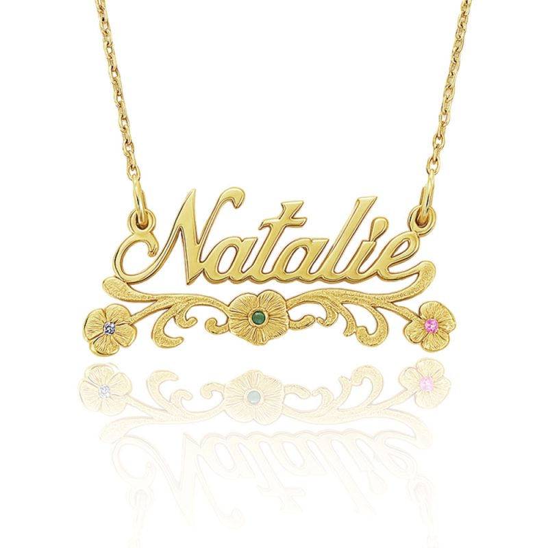 זהו תכשיט אומנותי אמיתי, שמגלם בתוכו את השם שלך באותיות מעוצבות באנגלית, בגופן מסולסל עם שיק נשי, קלאסי ואלגנטי – כשלאורך כל השם מתפתל לו קו תחתון עדין, המדמה גבעול פרחוני מסולסל – עם שלושה פרחים עדינים המשובצים באבני חן לבחירתך.